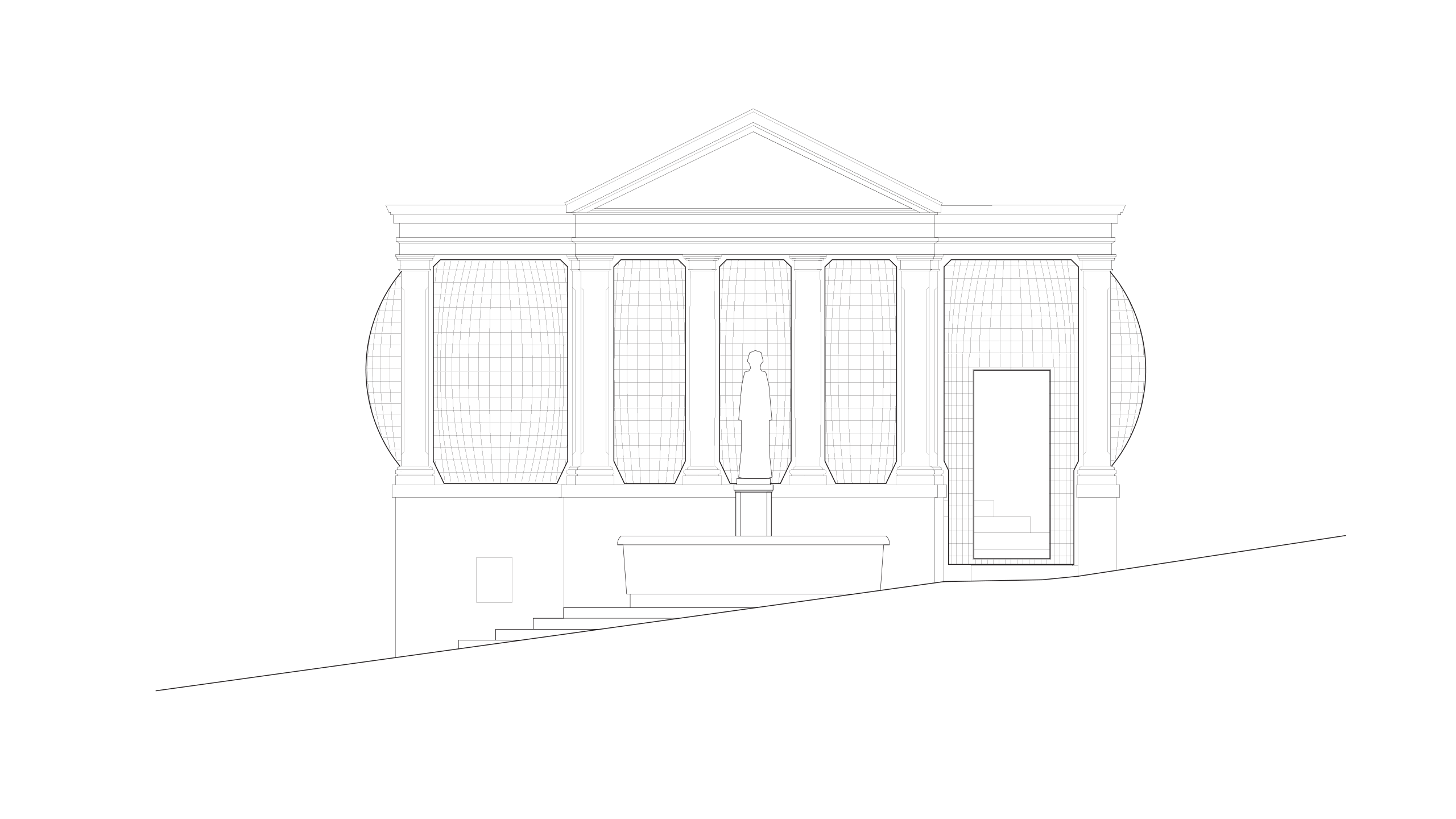 Set in an urban environment, the project creates a strong contrast between the mineral, static constructed elements and the dynamic, evolving planted areas. The vegetation colonises the temple from inside, swelling to overflowing. Defying all logic, the vertical lawns create a certain abstraction that emphasises the singular nature of the installation. It resembles a parasite, representing an anomaly set against an ordinary backdrop.