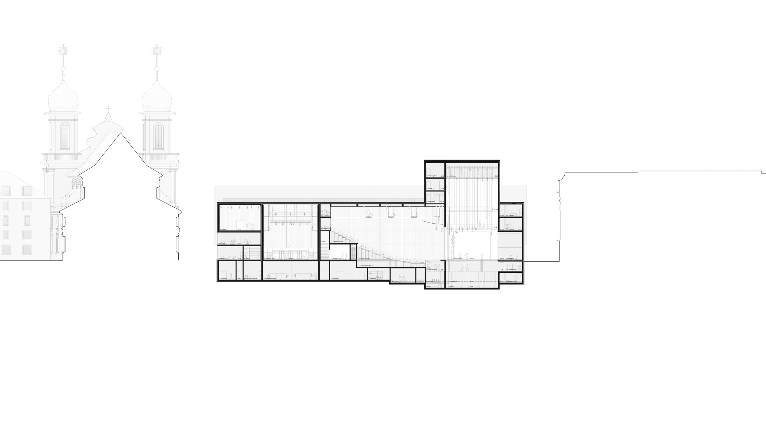The aspiration of the new theatre is to become a functional yet welcoming workshop. All technical functions are directly connected to the two main stages, as well as the audience reception, are located on the ground floor. This allows for easy operation and plays an important role in activating the surrounding public space. To the north are the restaurant and foyer that extends into the public space of the quay. To the south, the arrangement of the day store on the façade allows a view "behind the scenes" and provides a generous space for the delivery of scenery and the handling of scenery elements. On the Jesuit Church side, the artists' entrance is arranged for the staff.