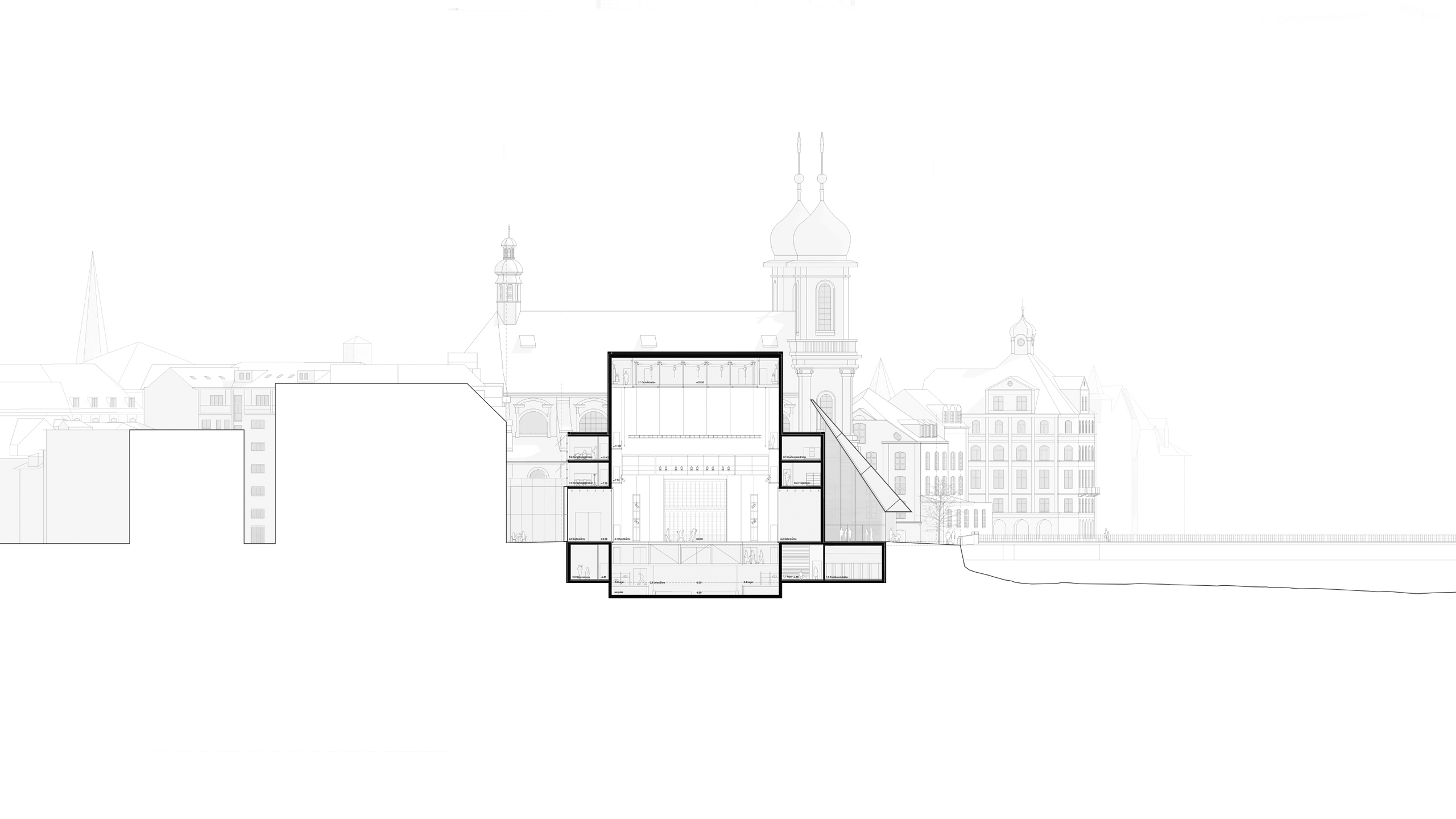 The project responds to its exceptional location on the banks of the Reuss river in front of the town hall. The new theatres foyer becomes part of the sequence of public spaces that determine the rhythm of the riverbank. The foyer is protected by a large sloping roof that defines the theatre's unique expression. It is arranged lengthwise along the bank and remains lower than the surrounding buildings. Through its abstract expression, the theatre affirms its status as a significant public building, nonetheless leaves to the Jesuit church its role as protagonist, which it has held since the 17th century.