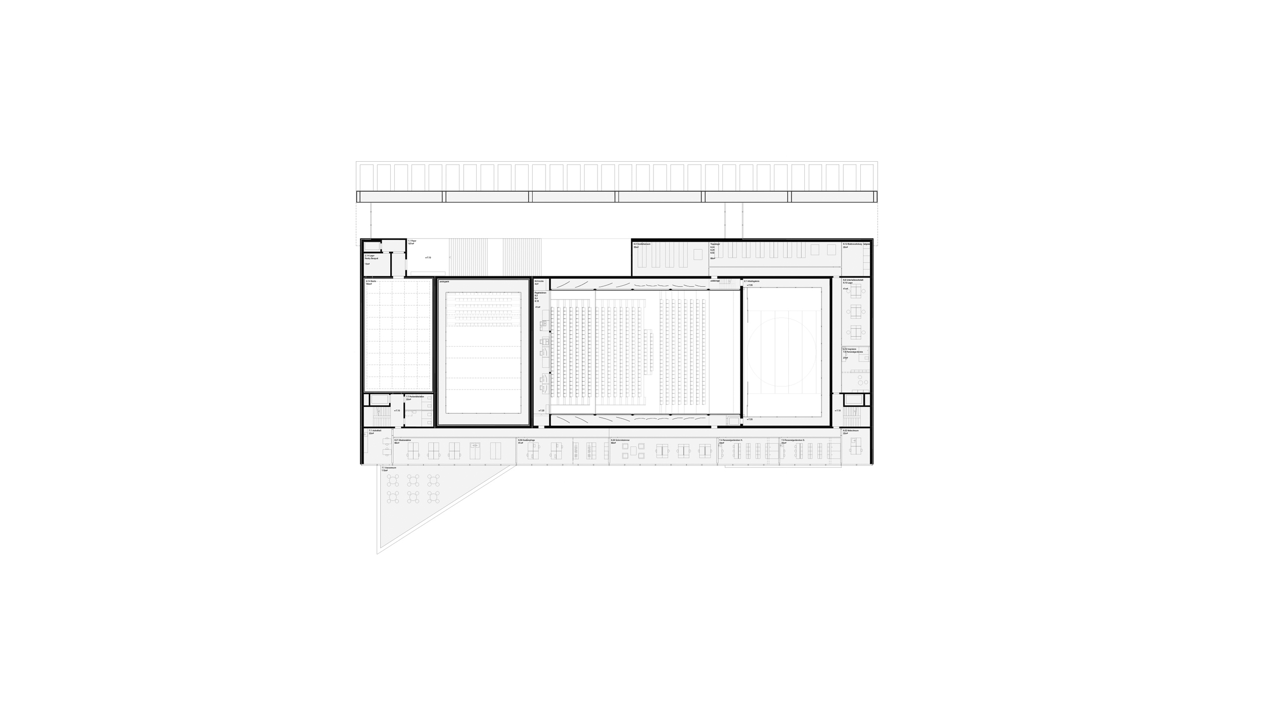 The three halls are arranged next to each other. The two main ones are on the ground floor, while the studio finds its entrance at the top of a generous staircase that is directly connected to the foyer. The public programme is arranged in the north, while the rooms for staff and artists are located in the south. The boxes and workshops, together with the day store, form the theatre's urban south façade.