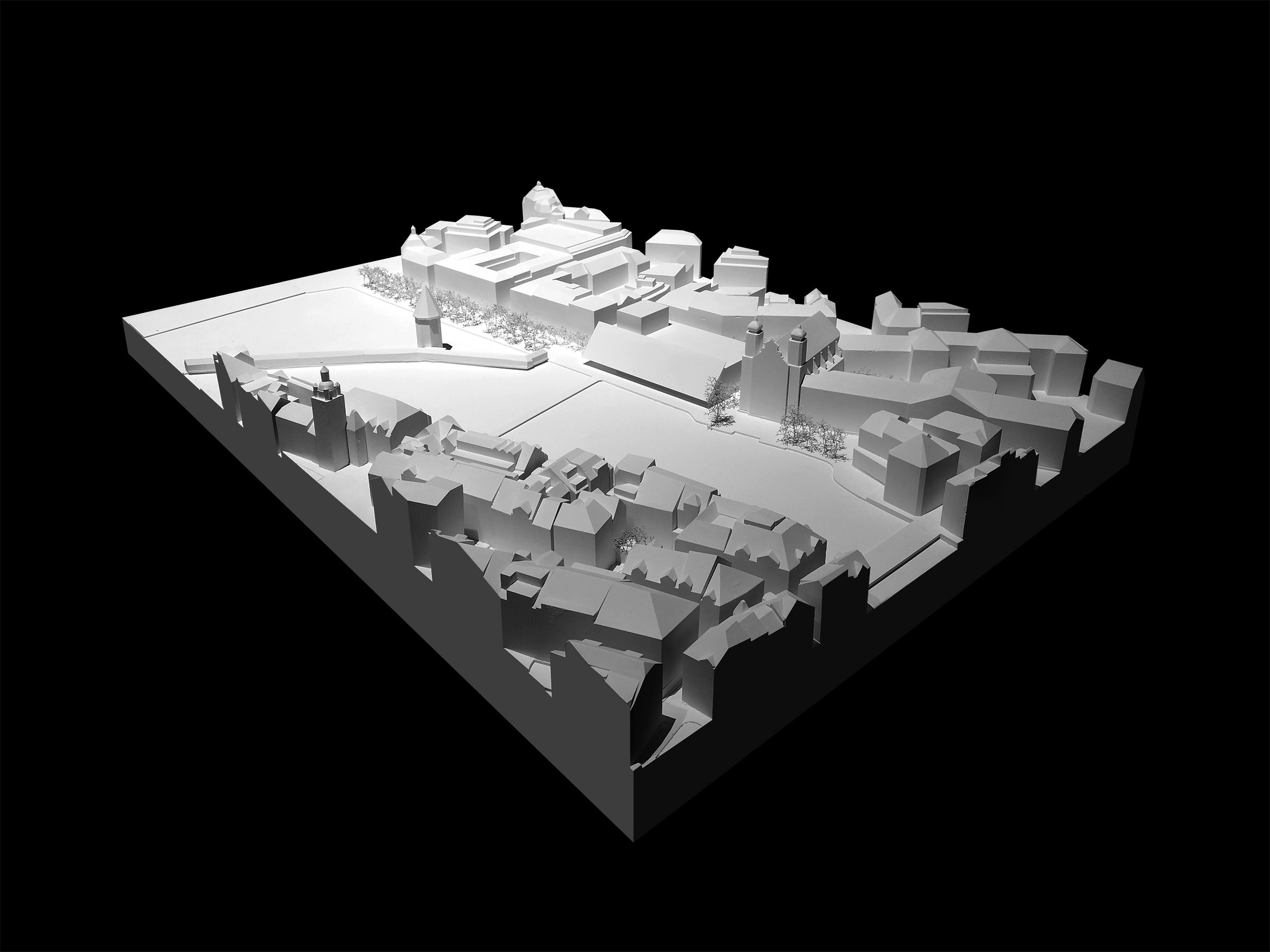 The project responds to its exceptional location on the banks of the Reuss river in front of the town hall. The new theatres foyer becomes part of the sequence of public spaces that determine the rhythm of the riverbank. The foyer is protected by a large sloping roof that defines the theatre's unique expression. It is arranged lengthwise along the bank and remains lower than the surrounding buildings. Through its abstract expression, the theatre affirms its status as a significant public building, nonetheless leaves to the Jesuit church its role as protagonist, which it has held since the 17th century.